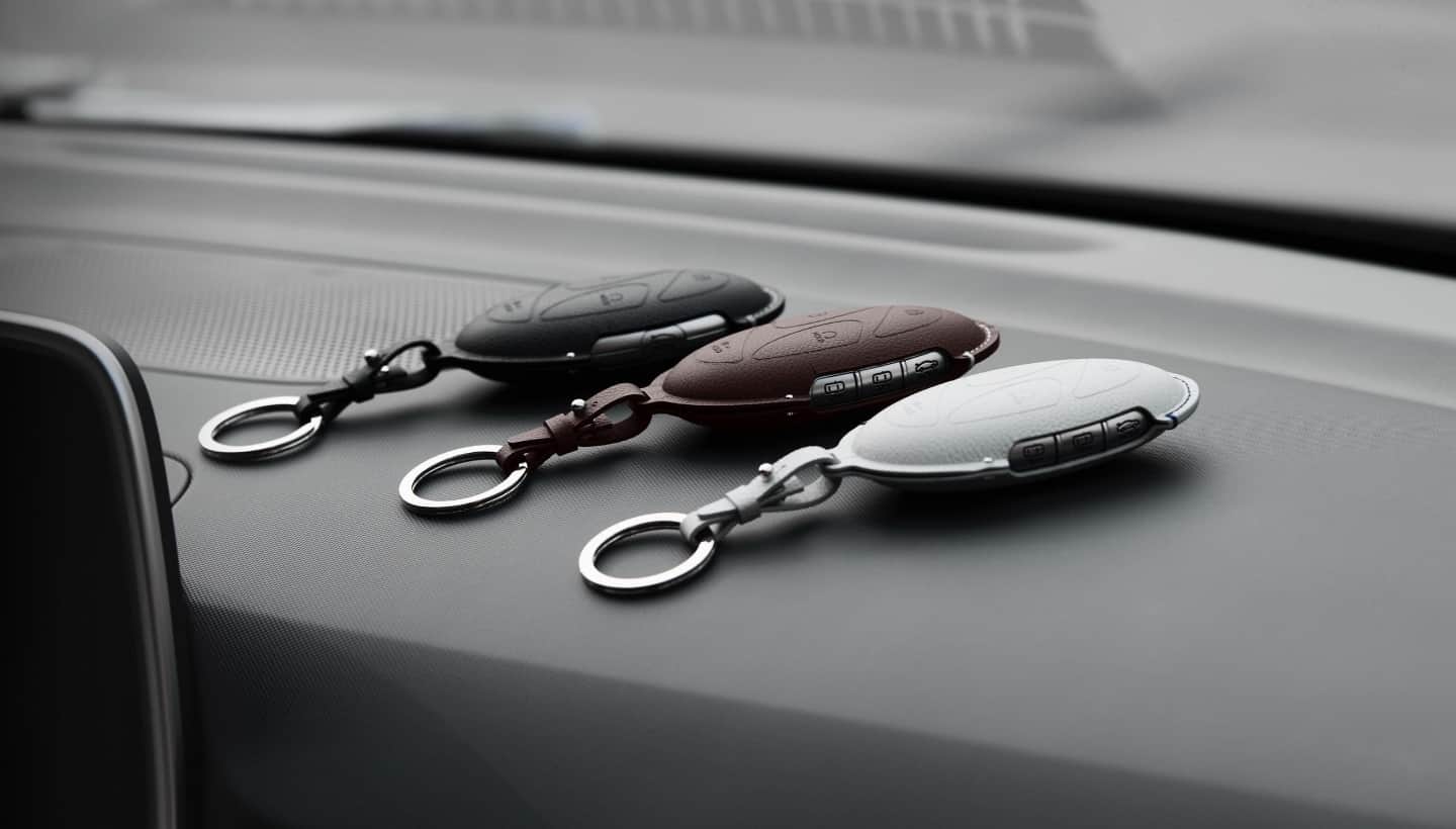 環境に配慮した素材で作られたレザーキーケースです。キーケースの背面にはHyundai EVのアイデンティティでもあるピクセルグラフィックのデザインを施すことで、シンプルかつ未来志向なイメージを表現いたしました。