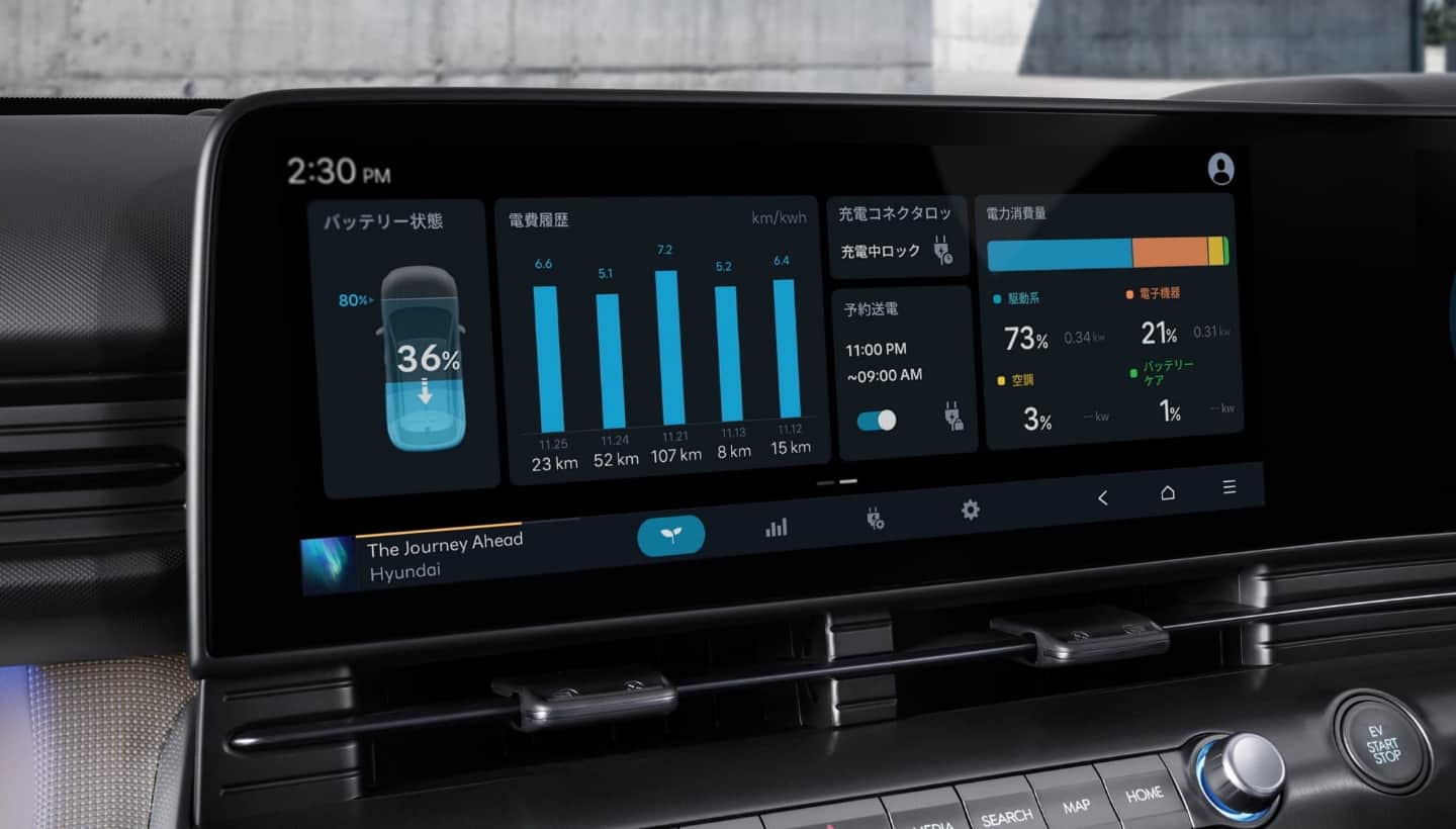 車両の走行情報と電費情報、エネルギーフロー図、ECOドライビング、バッテリーコンディショニングモードなどの多様な専用コンテンツのほか、充電ステーションの位置情報や走行可能距離の表示等、EVに必要なインフォメーションをドライバーにお知らせします。
