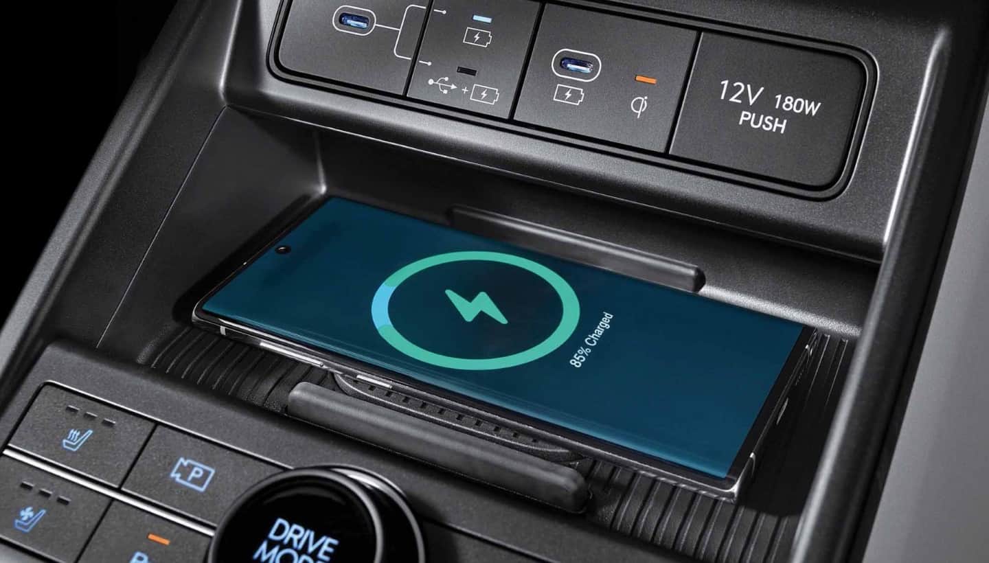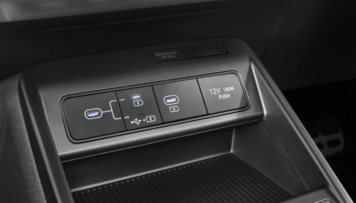 センターコンソール後端にある室内V2L機能を使って、車内で電気機器を使用できます。